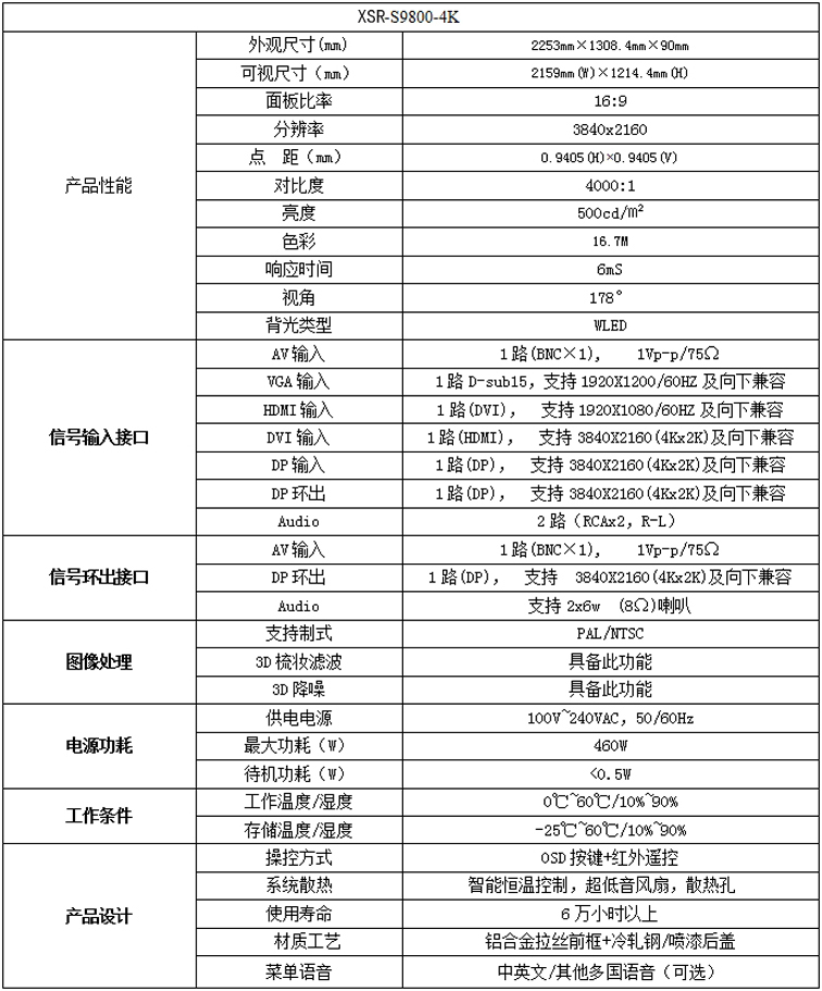新視銳98寸4倍高清液晶顯示器性能參數(shù)