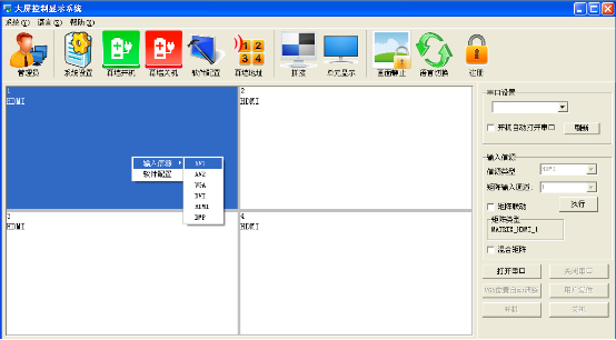 選擇單個或多個拼接單元進行開機/關(guān)機和單機鼠標右擊對輸入信號進行設(shè)置,也可以點擊“圖像凍結(jié)”可以凍結(jié)當(dāng)前的圖像,再次點擊解除靜像。