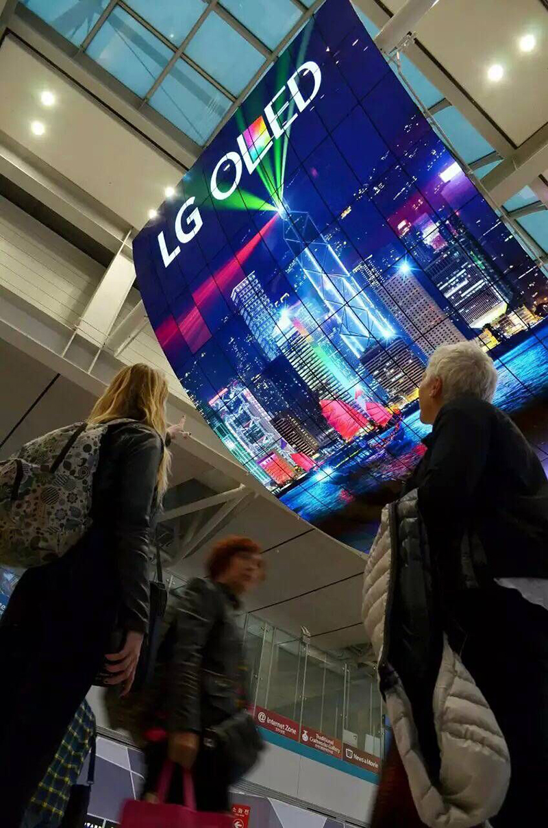 韓國LG顯示技術領域在亞洲都名列前茅,其在OLED有機發光二極管技術上更是獨占鰲頭,為彰顯0LED拼接屏技術成果,在仁川國際機場安裝了一塊10X14共140塊超大超窄的OLED拼接大屏幕,總面積達104平方米,堪稱拼接之最(拼接的最大屏幕)。