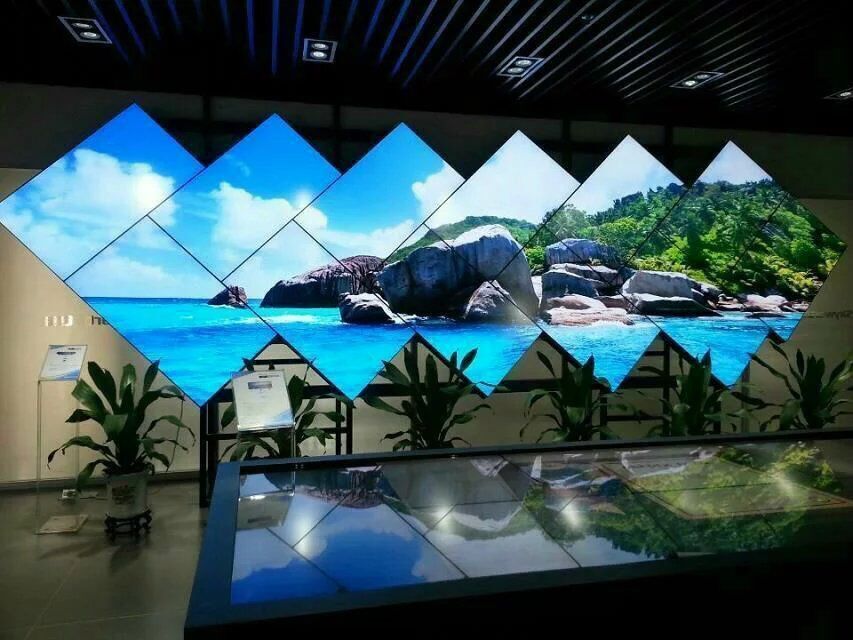 4:另外液晶還有一個最大的特點就是,液晶的拼接方式更加靈活,除了傳統的橫向拼接外,液晶還可以實現豎向拼接,這也就是人們常說的異形拼接,包括像30度到60度角度的傾斜拼接,或者是將16:9的顯示單元選裝90度等等,從而產生更加奇特的拼接效果,達到吸引眼球的目的。