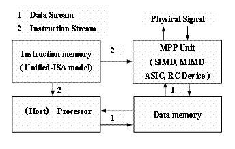具體對指令流體系結(jié)構(gòu)來說,其SISD、SIMD、MISD、MIMD四類體系結(jié)構(gòu)的指令子集合是統(tǒng)一成SISD體系結(jié)構(gòu)的指令集合,對于數(shù)據(jù)流與構(gòu)令流的體系結(jié)構(gòu)是通過增加相應(yīng)的指令,統(tǒng)一成SISD體系結(jié)構(gòu)的指令集合的;換句話說,圖1中的SIMD、MIMD、ASIC與RC Device四種 MPP Unit都是可以通過軟構(gòu)件描述的。這些軟構(gòu)件是可以在SIMD或MIMD體系結(jié)構(gòu)上直接執(zhí)行的,或者是可以自動映射成ASIC或RC Device電路的。
